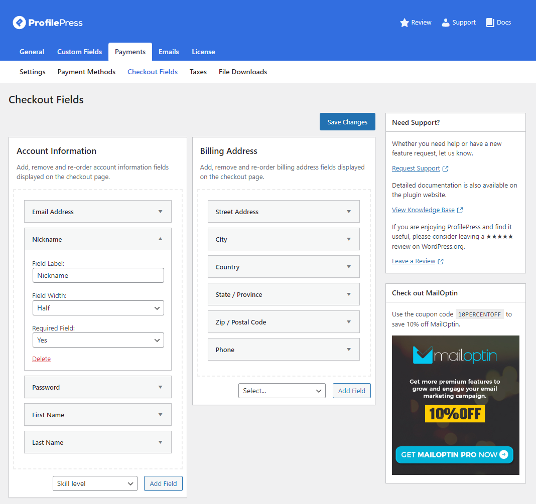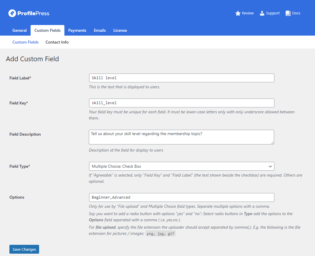 You can select the field type you want to create using the Field Type dropdown menu. For instance, to let users choose their “Skill level”, you can create checkboxes with options such as “Beginner” and “Advanced”. Click on the Save Changes button to continue.