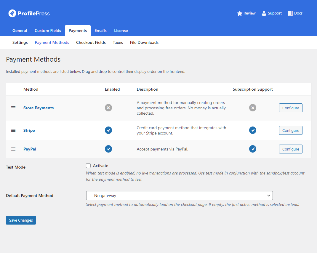Now, click on the Payment Methods link. You can drag-and-drop payment methods to arrange and configure them according to your requirements. You can also specify a default payment method. Click on the Save Changes button to continue.