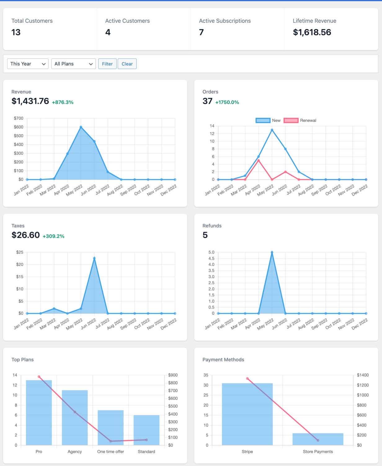 The ProfilePress dashboard gives you an overview of your membership site’s performance and lets you filter out data by each membership plan.