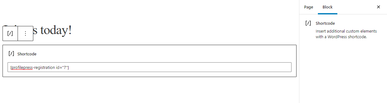 Similarly, create one to display the custom registration form, then paste the form shortcode before clicking the Publish button.