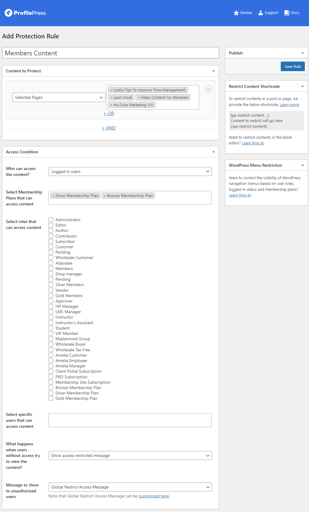 Once that’s done, use the Access Condition meta box to set user access. Next, select Logged in users using the Who can access the content? dropdown menu and specify the membership plans that can access the restricted content using the Select Membership Plans that can access content field. Once you’re done, click on the Save Rule button to continue.