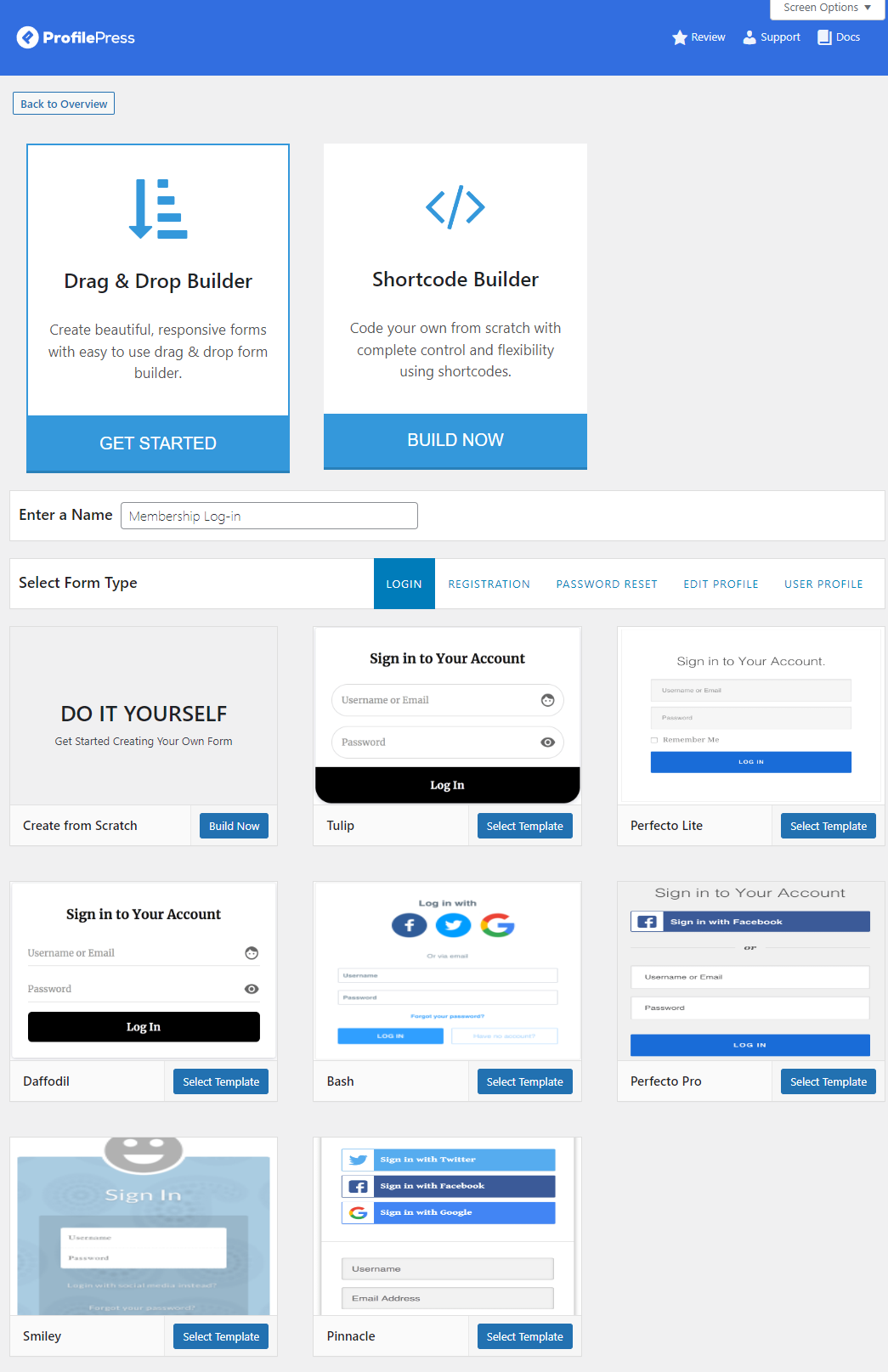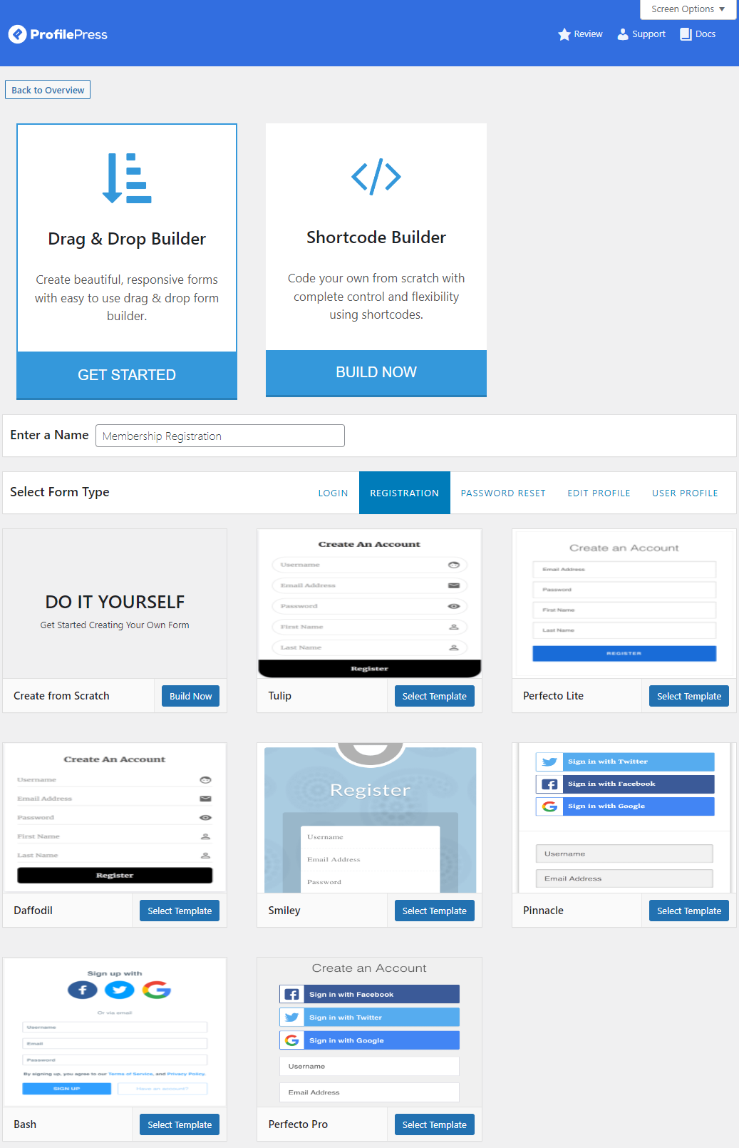 After selecting the Drag & Drop Builder, give your form a new name and select Registration from the Type section. You can start creating your registration page using a prebuilt template that matches your brand’s aesthetic. Once you click the Select Template button, you can edit your registration form.