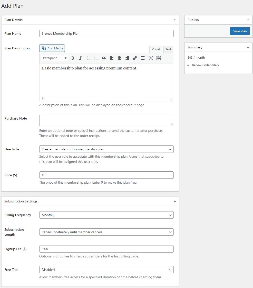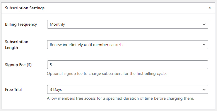 After entering a price for your membership plan, you can use the Subscription Settings meta box to set its duration.