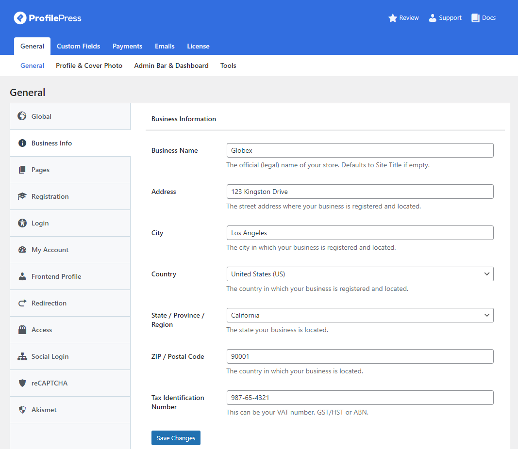 Click on the Business Info section and enter basic details about your business here. Once you’re done, click on the Save changes button to continue.