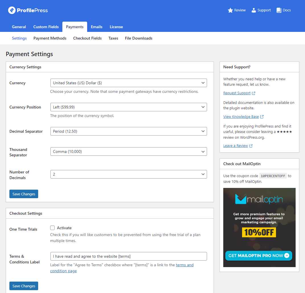 You can set basic payment settings (such as the currency options) and select the terms and conditions page on your membership site. Make sure to click on the Save Changes button once you’re done.