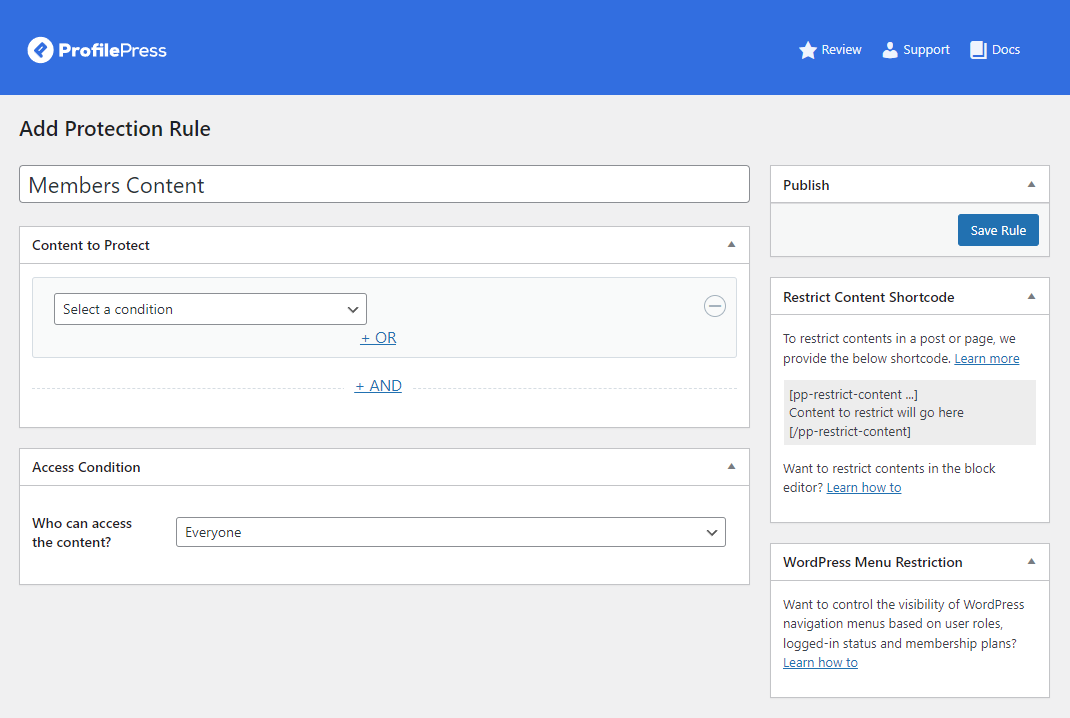 Most membership sites have member-only premium content that’s restricted behind a paywall and only lets users access it after subscribing to your membership plan. To do this, navigate to ProfilePress → Content Protection from the WordPress admin panel and click on the Add a Protection Rule button.