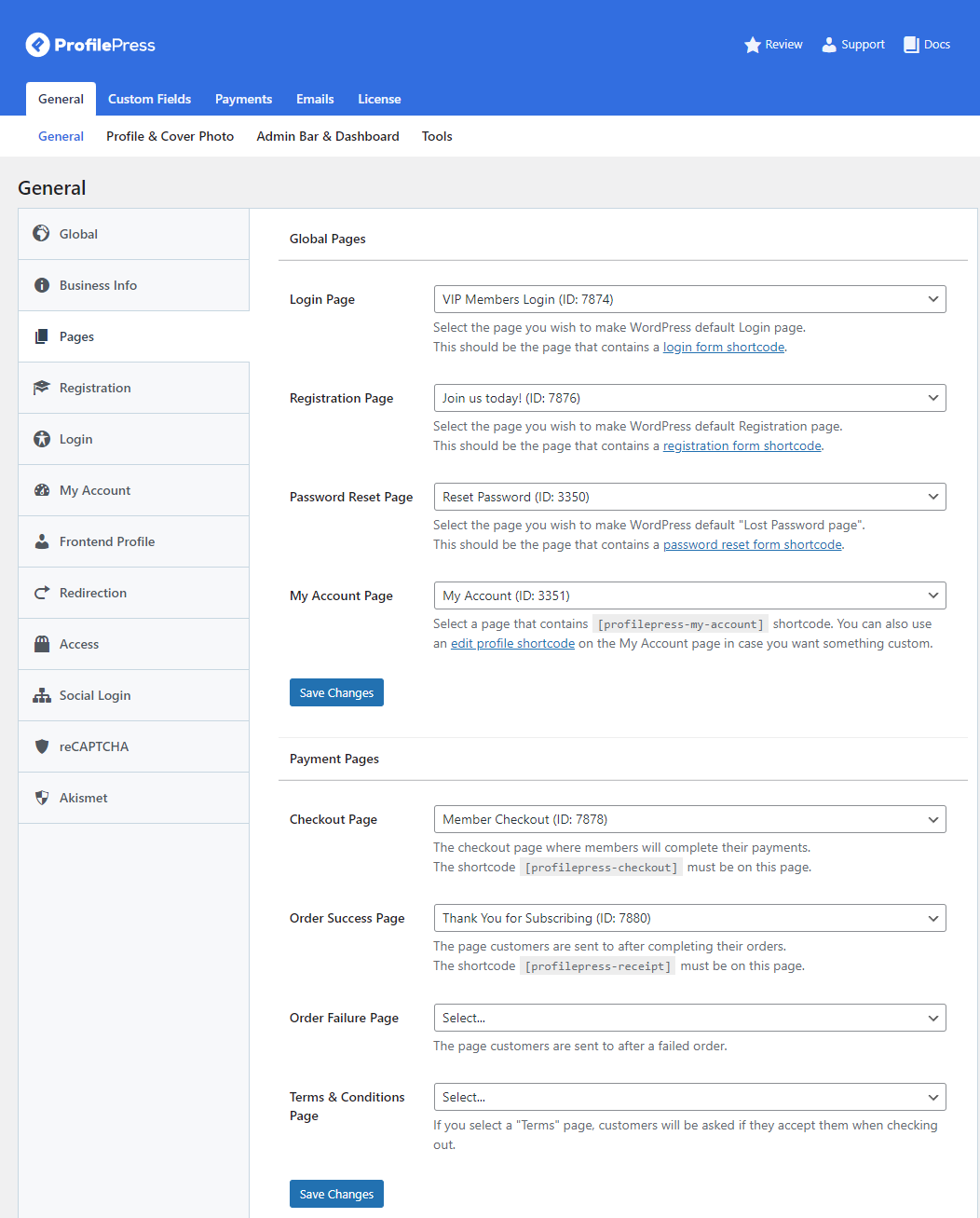 Select the pages you want to use the ProfilePress custom form shortcodes on, then click the Save changes button to continue.